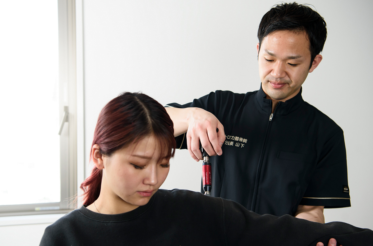 トロイカ整骨院では、トムソンベッドを使用し、肩関節や肩甲骨の動きを広くする骨格矯正を行います。アクチベーターを使用し、胸椎や肋骨を優しく矯正。そして、手技によって筋肉をゆるめることで、肩の可動域はグンと広がります。